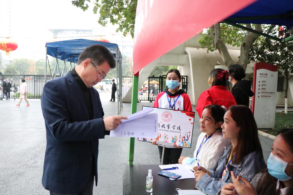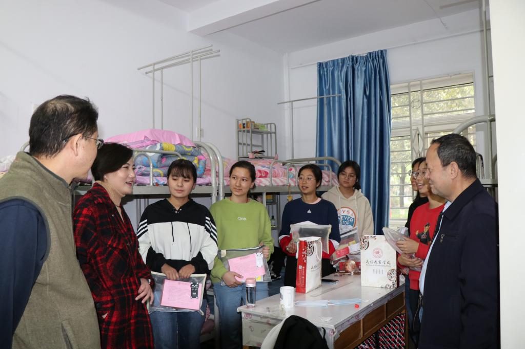 领导向新生赠送学习礼包并给予期望,说到:“手提袋中的石榴寓意着各少数民族要像石榴籽一样紧紧抱在一起,此时正值中秋国庆双节同庆,月饼代表着家人团圆,念家时可以用信封寄出思念。”本次走访,不仅为新生的学习和生活给予指导,同时也体现出学校和taptap