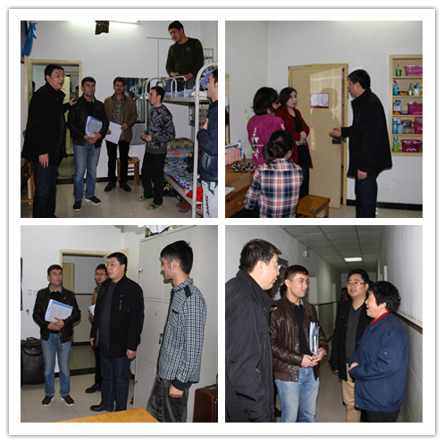院长冯建新、副书记窦文阳、班主任阿布都、王龙宇、李佳静、丁邵玉龙、王磊,共同走访学生公寓,查看寝室卫生及安全情况。