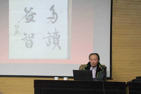 讲座的开始,李继凯教授告诉同学们,今天的讲座适合全体学生,不分专业,都能听的懂,而且读书关乎大家以后的发展,所以更要重视起来。首先,李教授抛出了一个引语“读书与大现代”。他说,大现代是指中国现当代文学,视野通古今中外,大文化融成现代。现代为大,包容大小。读书是无止境的要善于读书,读书好,读好书。读书是从不了解到了解,到喜爱。当代的学生应该利用好在学校的时间,多读书,丰富知识。其次,李教授和同学分享了读书的乐趣,以及自己在读书方面所获得成就,迎来了现场热烈的掌声,李教授分别对鲁迅异地求学,弃医从文。郭沫若才子书缘,创造情结。矛盾勤能补拙,师者品格兼及金庸的读史和莫言的读硕做了详细的介绍。他们都是一代文豪,他们的作品值得同学们去细细的品味去学习。最后,李教授讲到了书法,他说,书法是和文学分不开的。中国古今文人作家与书法文化的关联非常密切,作家文人和书法家都是主要以书写为生的。在书法文化创造方面都有着重要贡献。他举出了卫俊秀的“拥书自雄”,沈尹默的“读书与书法”史星文的“书房和书法”。