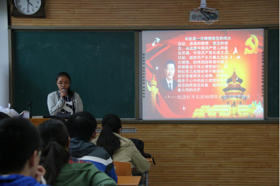 10月21日,在兼职辅导员蒙桂芳的带领下,我院预科一班同学在教学九楼9705教室举办了以“蓝图已绘就,奋进正当时”为主题的班会,本次班会中,同学们观看了有关长征精神的影片,感受长征精神,体会长征文化,探讨有关长征的问题,全方位,多层次地了解长征内涵。通过影片,同学们“重走了”长征路,渡铁索桥,走雪山,过草地,直至最后胜利会师,同学们身临其境,时而揪心难过,时而热血沸腾,毛主席的词句萦绕在同学们脑海:“雄关漫道真如铁,而今迈步从头越。从头越,苍山如海,残阳如血。”在这里,班会的气氛达到了最高潮。几位同学谈了谈自己所理解的长征精神,有同学说:“我们要为崇高理想信念矢志奋斗,同时加强自信,将长征精神渗透到我们生活的每一个角落,并转化为动力,激励我们更好的学习与生活。”同学发言后,现场掌声雷动,经久不息。