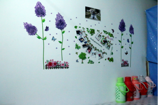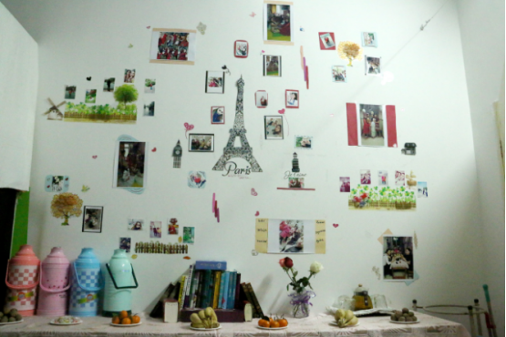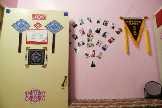 评审组首先来到12号男生学生宿舍楼进行观摩,接受观摩的部分宿舍代表向大家介绍了其寝室的布置方法及亮点,个别男生宿舍将寝室将墙壁一角制作成愿望墙、文化天地栏等,有的还贴了各式的壁纸,铺上了各样的地毯,使寝室成为“星球世界”、“运动天地”等,整洁干净、通风良好、富有创新的男生宿舍使各位评审老师刮目相看。接着评审组来到2-3号女生宿舍楼进行观摩,女生宿舍与男生宿舍文化差异甚大,一些手工艺妆品、本土文化特色充满温馨的寝室,废弃饮料瓶纸做的书架、小纸帽做成的吊链,宿舍门上的贴花和装饰都充满民族情怀。从这些宿舍装饰中,流露出同宿舍不同民族成员之间浓厚的感情和同窗友谊。