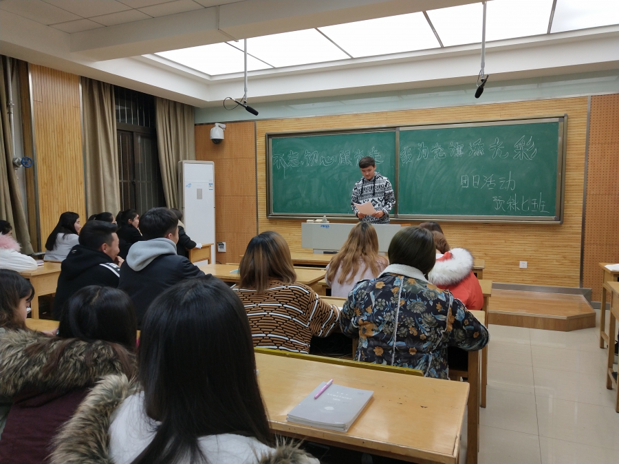 班会伊始,我班团支书穆开热木强调要深入学习贯彻习近平总书记系列重要讲话精神和治国理政新理念新思想新战略的同时,要求团员青年要听党话、跟党走,以奋发向上的精神状态,高度的思想和行动自觉学习贯彻党的十九大报告精神。班会上,同学们围绕着社会主义核心价值观和十九大报告内容,畅所欲言,谈看法、谈感受、谈希望、谈未来,结合自己的实际情况,更加明确了肩负的责任,表示了会更加努力地成才报国。