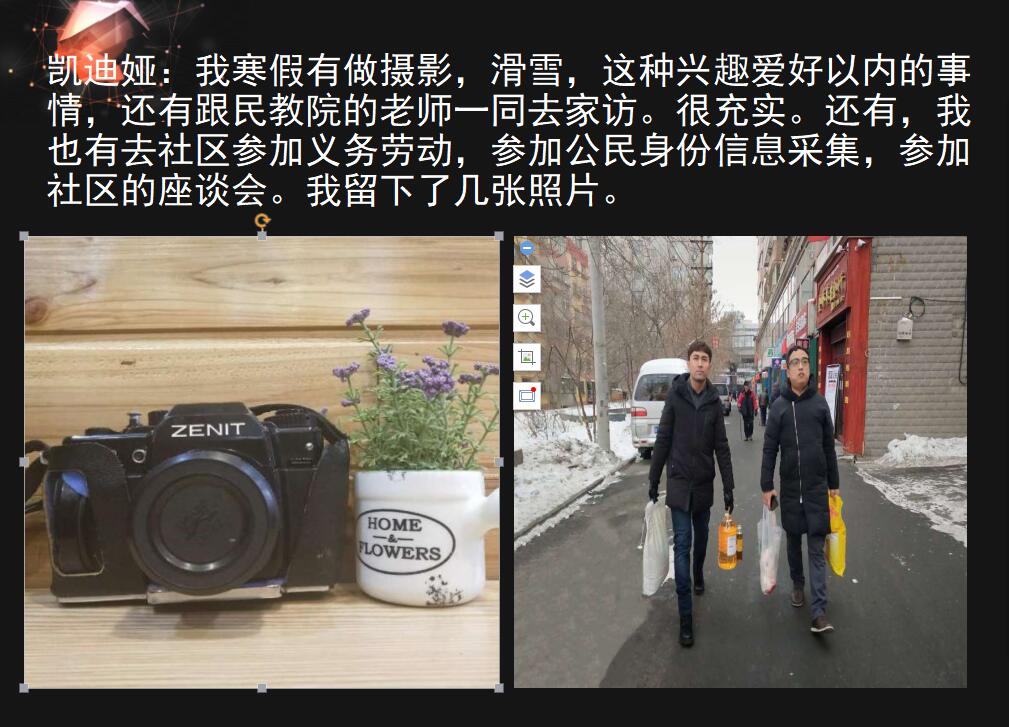 “这个假期,是一个奉献自我的假期”预科7班的阿力木·艾尔肯说到。他在家乡的丰富多彩的社区生活中感受很多,他说,他每周一参加社区举行的升旗仪式,感叹在看到国旗飘扬在碧空中那一刻的庄严与自豪;他更感受到利用自己空闲时间替社区搜集住户资料、随社区干部一同走访贫困家庭,在寒风中送去温暖时被称赞的喜悦之情。大家也被阿力木同学在严寒中进行社区服务献爱心活动的奉献精神,为社区服务的高涨热情所动容,从中感受到了的这个寒假社区生活的意义非凡。
