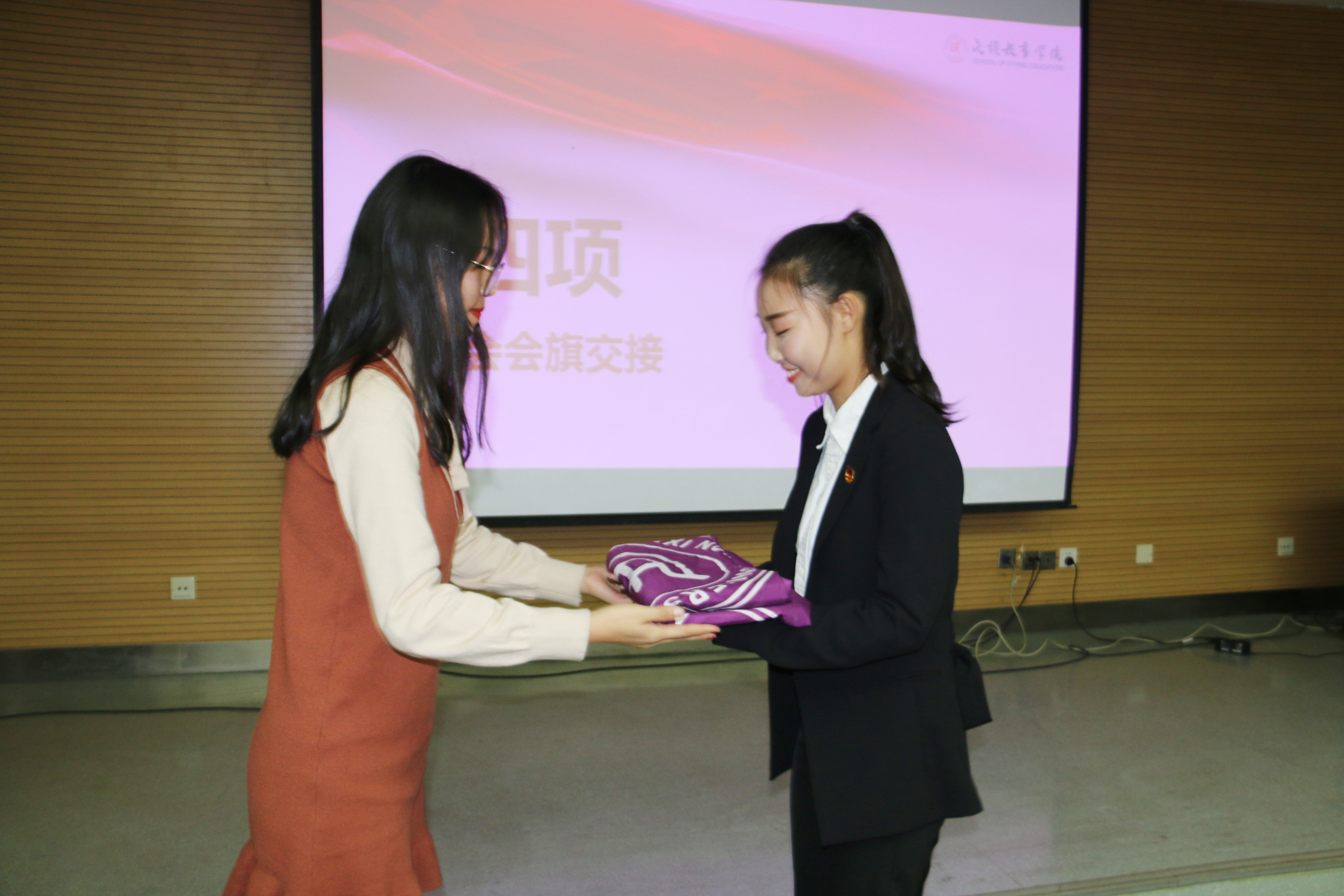 学生会副主席赵宁与新一届学生会主席阿茹罕进行了学生会会旗交接仪式。随后taptap