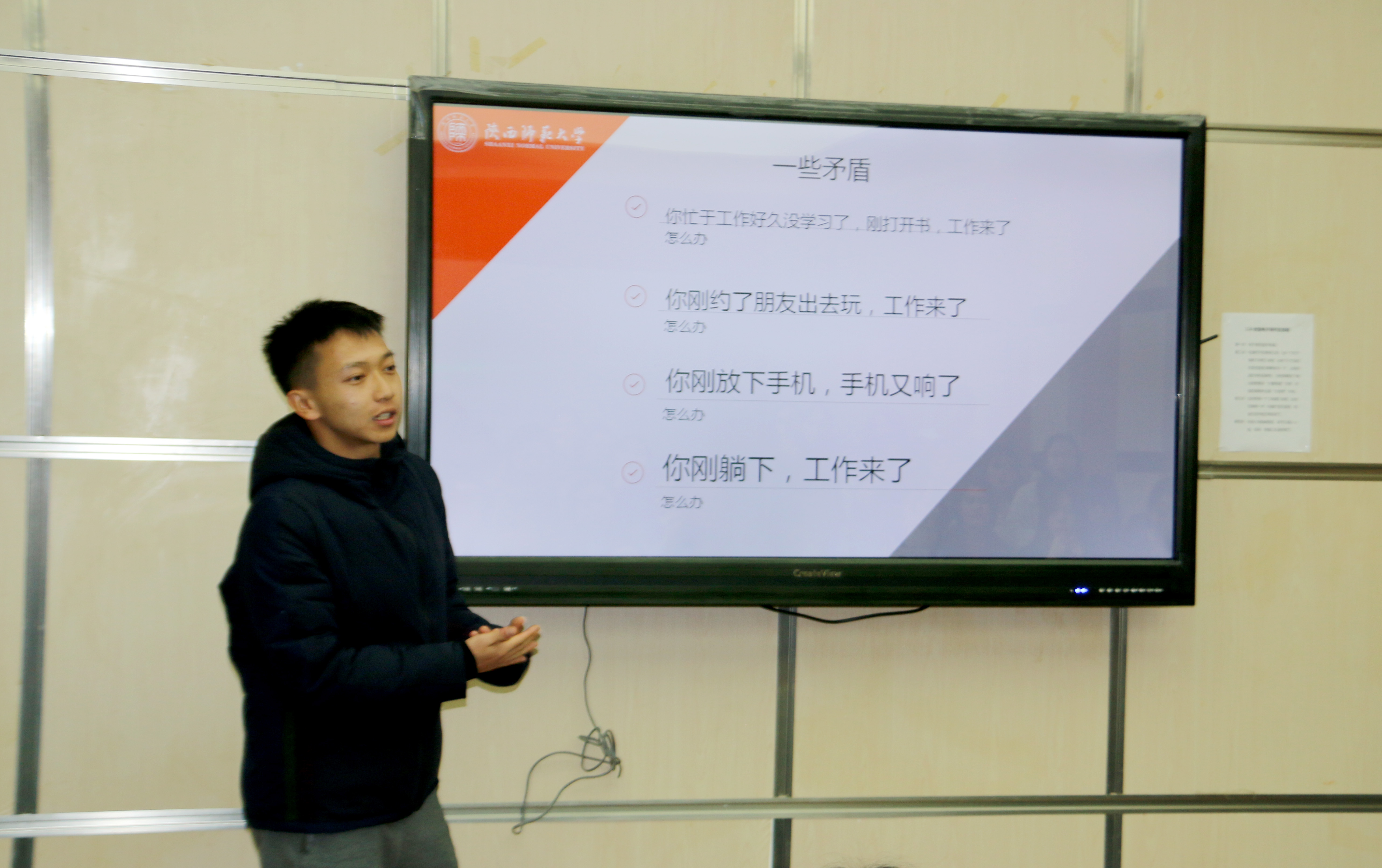 随后,蒋思扬学长做了分享交流,说到自己在工作上遇到的困难及解决措施。要求大家在工作上友善,主动,乐观,有计划,少一些功利心。白日学长也与大家分享了自己的得与失,使得大家更深刻地了解了学生会工作与学习之间的权衡性。