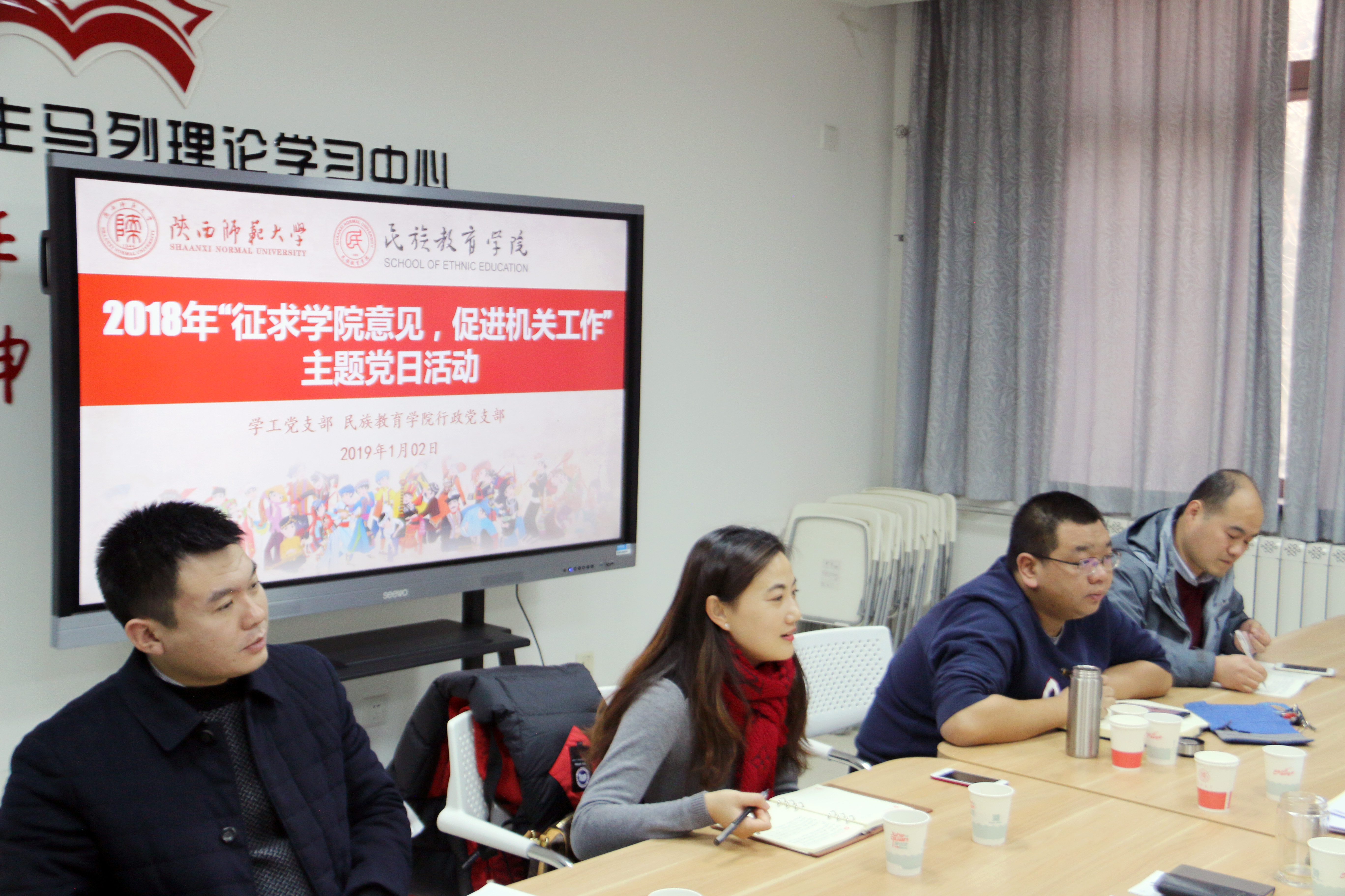 意见、促进机关工作”主题党日活动。党委学工部(学生处)副部(处)长、学工党支部书记蒋毓新,少数民族教育管理科科长李钊,雁塔校区综合管理科科长李晨子,干部雷培强、白克阿力与我院党政领导班子、师生代表座谈交流,全面了解我院在教学、科研和管理等方面对学校机关单位的意见和建议。