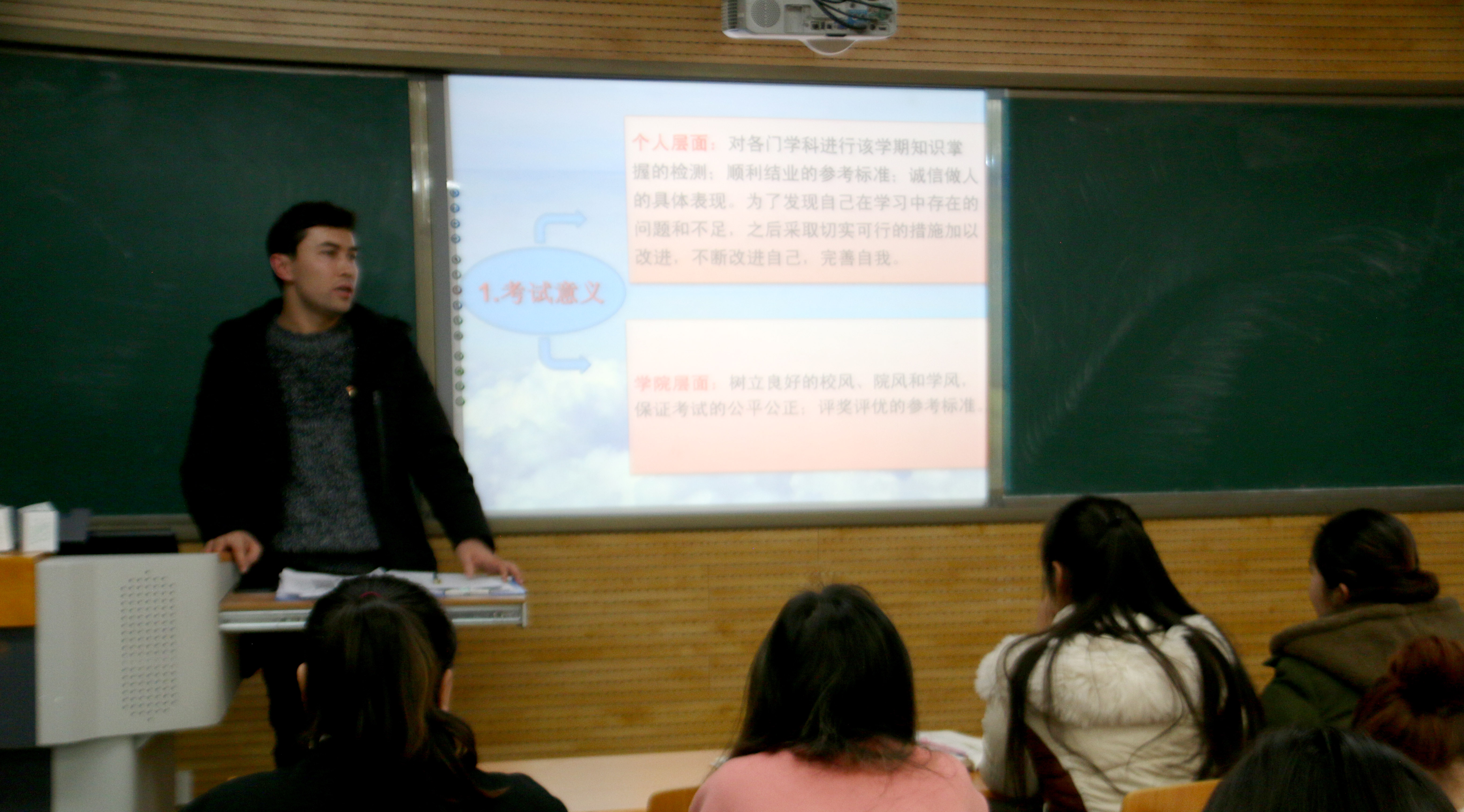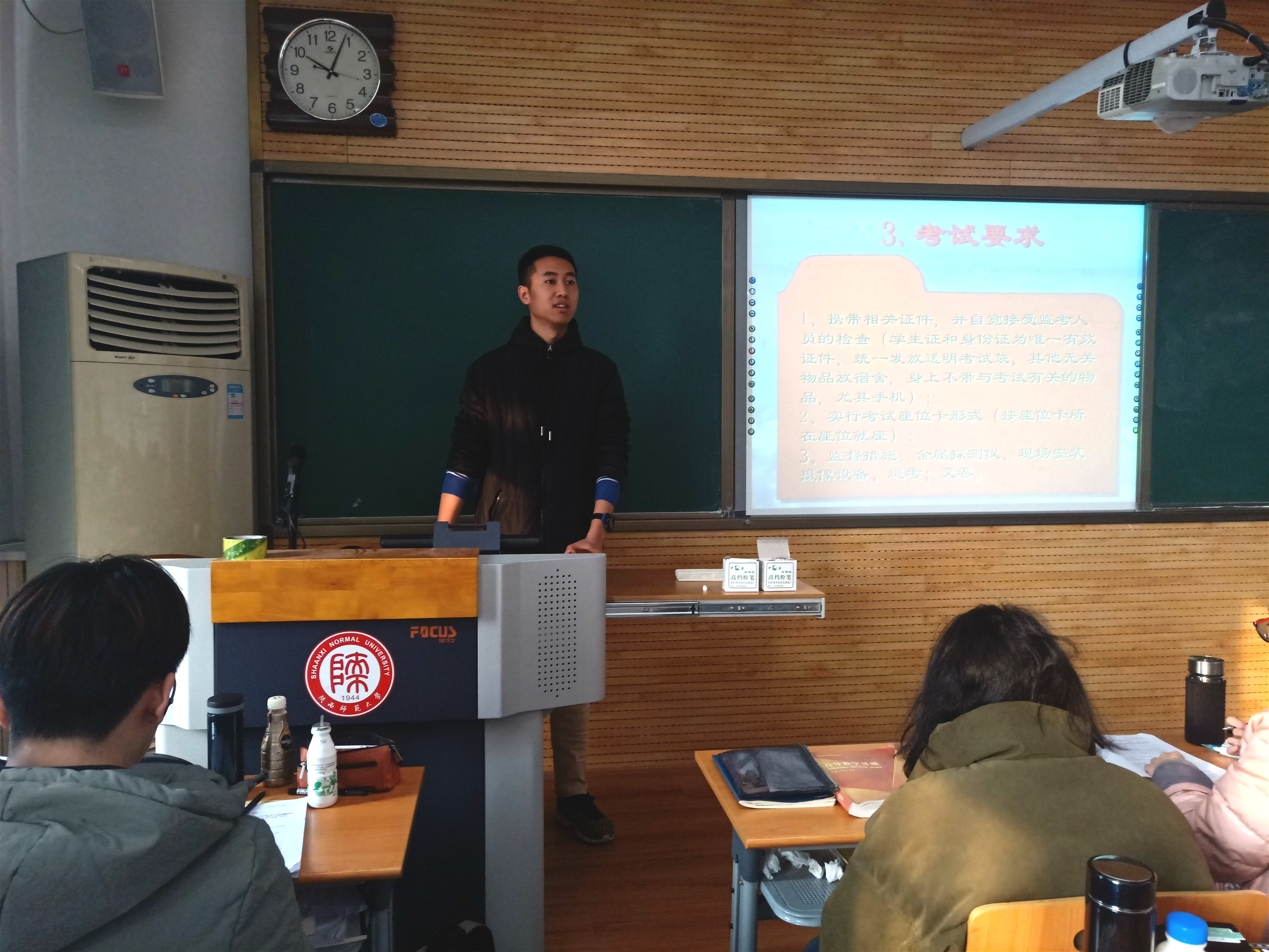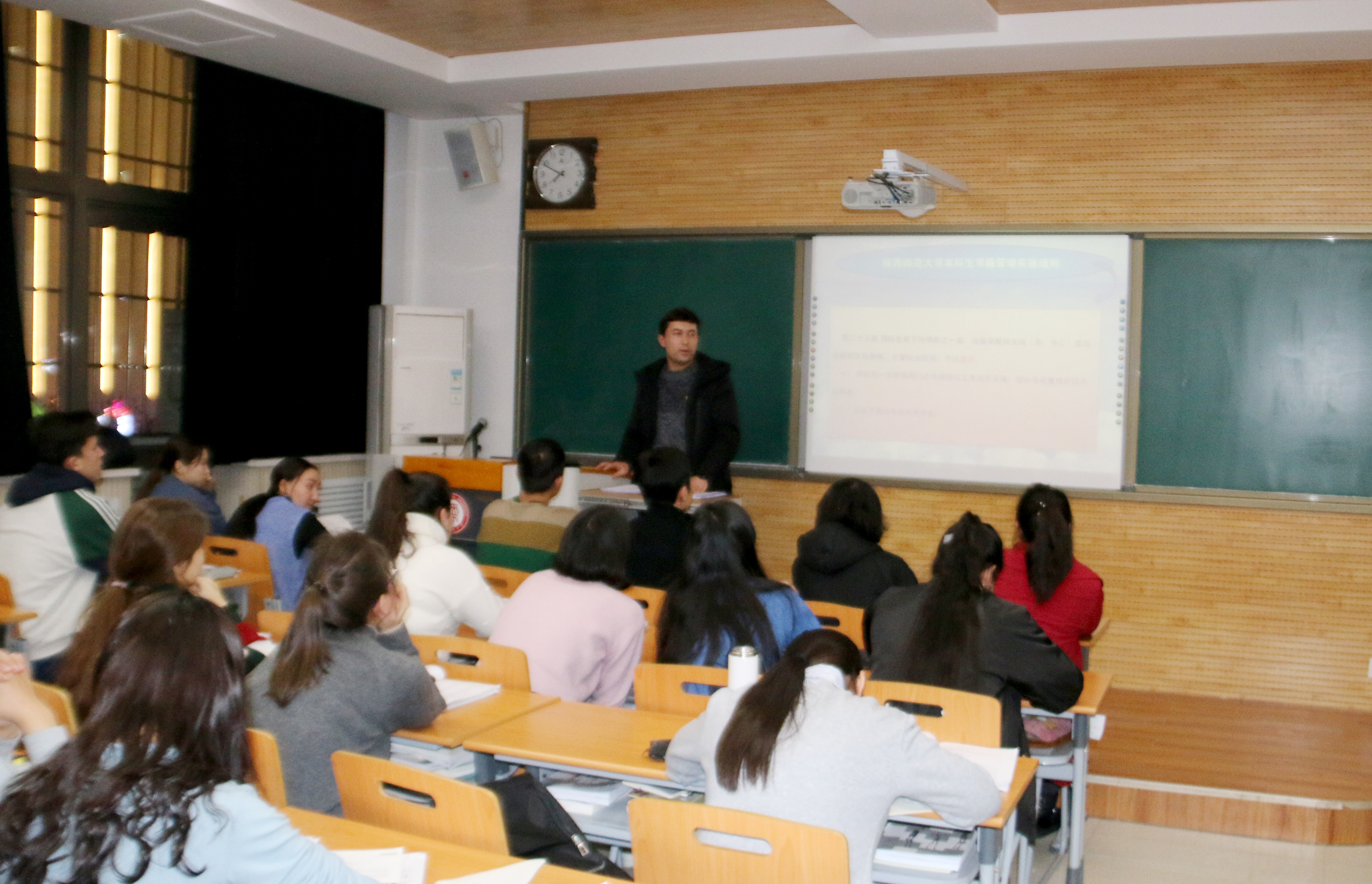 层面的重要意义,向同学们介绍了期末考试安排、诚信考试的重要性以及考试违纪会给大家未来造成的严重危害,并列举出《陕西师范大学学生违纪处分规定》条例来进一步说明,嘱咐同学们一定要合理的安排时间认真复习,把握基础,真正将知识学到手,为未来的专业学习打下坚实的基础,积极践行以“爱国、求是、团结、奋进”为核心的民教精神,并预祝同学们争取获得满意的成绩。热依木老师指出结业清考已经取消,要求同学们严肃考风考纪、珍惜参考机会、认真对待考试。他还强调了学生寒假实践、撰写读书笔记、家乡新变化、预科感想及社会实践问卷调查等学习与实践活动的安排,对本学期放收假时间和请假流程、学生购买火车票、寒假安排、假期安全等事宜给予了详细说明。最后,为每一位学生发放考试用具装放的透明文件袋,同学们签订了考试承诺书。