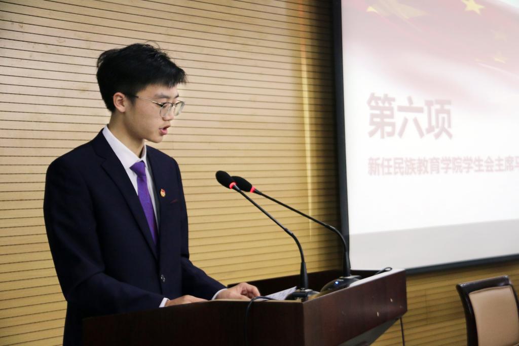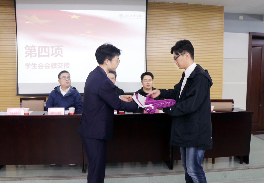 随后,我院2018级学生会副主席奥宁与新一届学生会主席马得胜进行了学生会会旗交接仪式。奥宁同学代表2018级学生会做工作总结,在总结中他介绍了过去一年学生会的工作情况,分享了工作感想,并提出了相关建议,期望新一届学生会成员能不断开拓进取,切实努力,提高综合素质能力。新任学生会主席马得胜同学在发言中阐述了自己对学生会、学生干部工作的认识和思考,并提出了新一届学生会几点工作思考和设想,希望全体学生会成员做好基础工作的同时紧跟时代步伐,不断创新,充分发挥学生会组织优势,在全心全意为同学服务的行动和实践中成长,促进学生会工作更上新台阶。