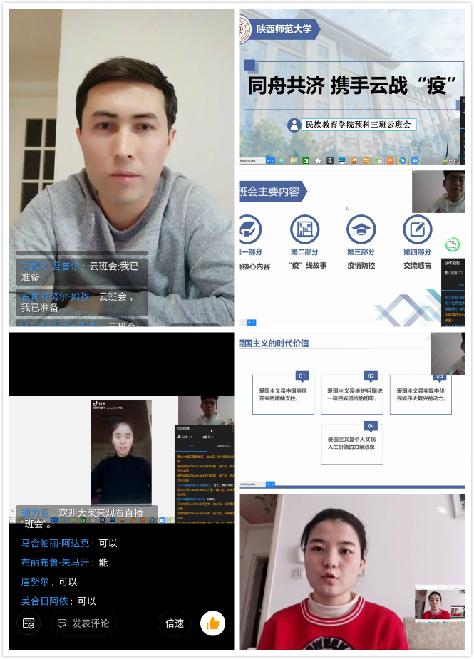 预科三班则以“同舟共济携手云战‘疫’”作为云班会主题。班会上,同学们讲述了新疆医护人员援鄂“疫”线的真实故事,阿尼克孜同学说:“他们的故事让我深受触动,正是因为这些‘最美逆行者们’挺身而出,义无反顾地冲锋在战‘疫’第一线,才为防控疫情提供了最坚实的保障,我们应该记住并永远感谢这些替我们负重前行的英雄。”最后辅导员热依木老师做了班会总结,并提醒同学们要客观冷静地看待此次疫情,更要提高对网络谣言的甄别能力,做到不造谣、不信谣、不传谣,传播正能量。