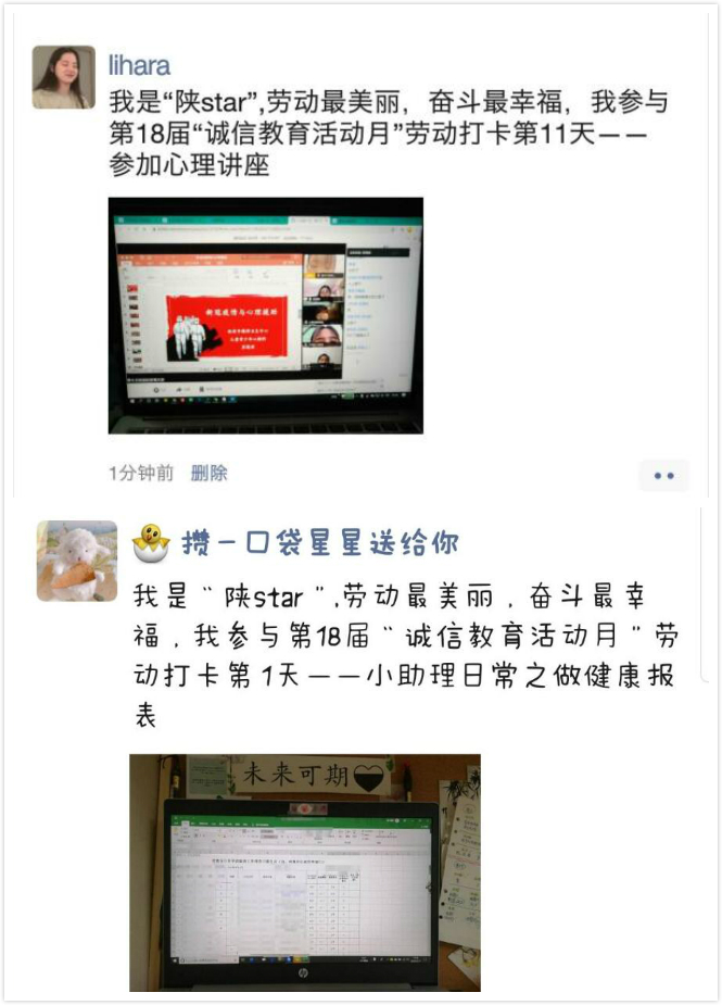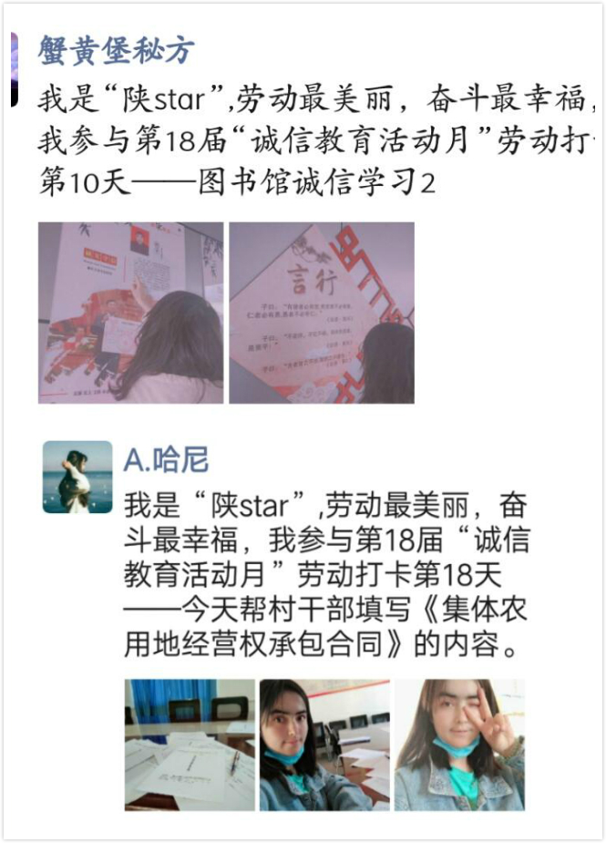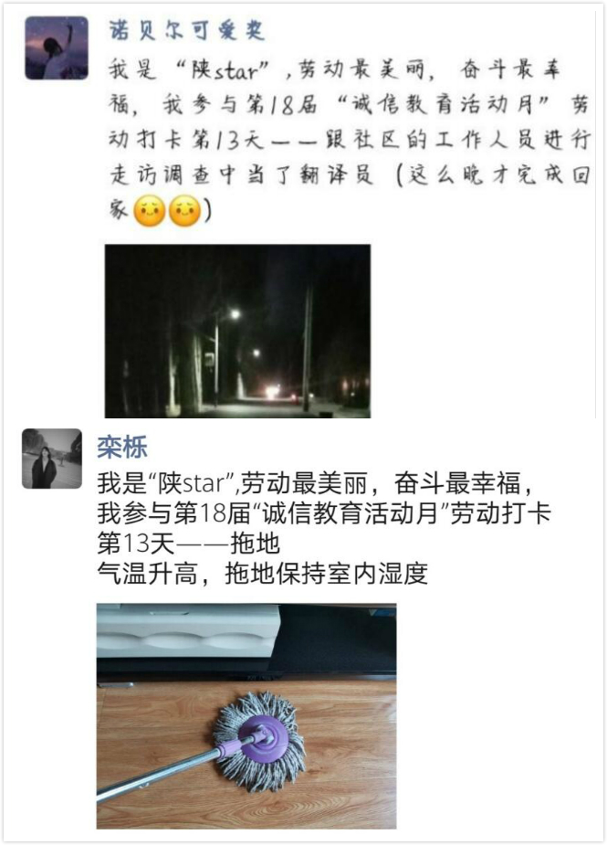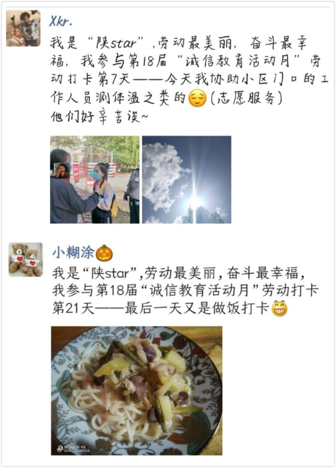 丰富主题教育活动形式,开展“21天”诚信劳动打卡活动。鼓励学生将连续21天参与劳动的画面进行线上平台展示,分享劳动心得体会,较好地提升了学生门热爱劳动、诚实守信的思想意识。我院76名学生积极参加此项活动,分享了自己劳动收货和感悟。
