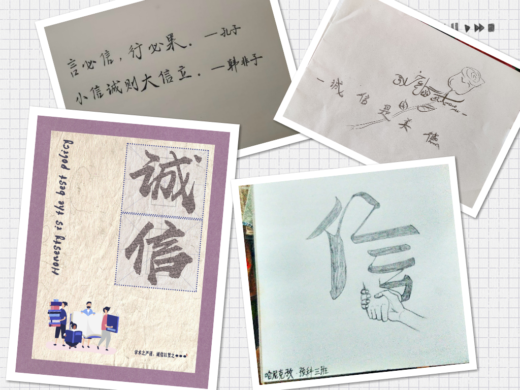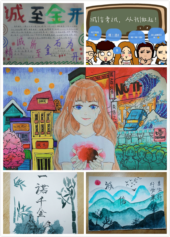 同步开展书法、绘画、海报、篆刻、剪纸、漫画等诚信主题作品创作活动,活动一经发布,得到了全院预科学生的积极响应,参与气氛浓厚,佳作频出,引人共鸣,活动中我们共收到了20名学生的创新作品。
