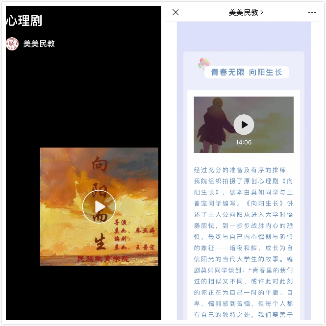 我院学生于5月原创编剧排演拍摄心理情景剧《向阳而生》,该剧主要讲述主人公向阳从进入大学时懦弱胆怯,到一步步战胜内心懦弱与恐惧,战胜心魔,成长为自信阳光的当代优秀大学生的故事。该剧在taptap