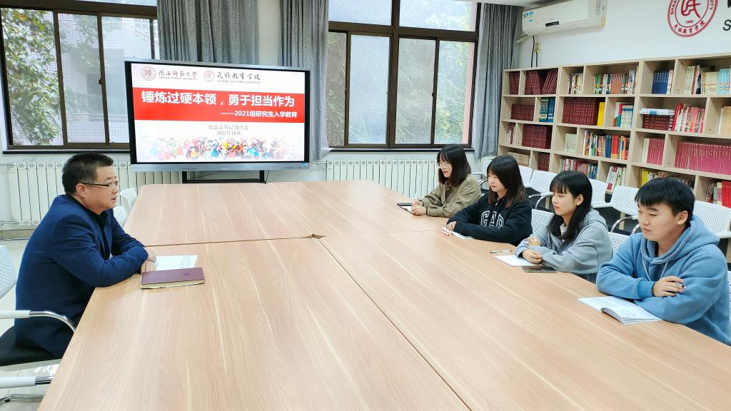 党总支书记郑生忠为2021级研究生新生作了以“锤炼过硬本领、勇于担当作为”为主题的新生入学教育。希望通过入学教育,引导学生端正思想、调整心态、找准定位,以昂扬的精神状态迎接崭新的研究生生活,以更积极的心态投入到紧张而又充实的学习中。