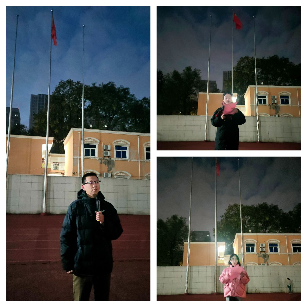 6:30整,英姿飒爽的国旗护卫队,在护旗手与擎旗手的引领下,护送着鲜艳的国旗迈着铿锵有力的步伐徐徐前进,他们目光坚定、神色肃穆。庄严的国歌声中,五星红旗迎风升起,全体师生面向国旗齐唱国歌、行注目礼。