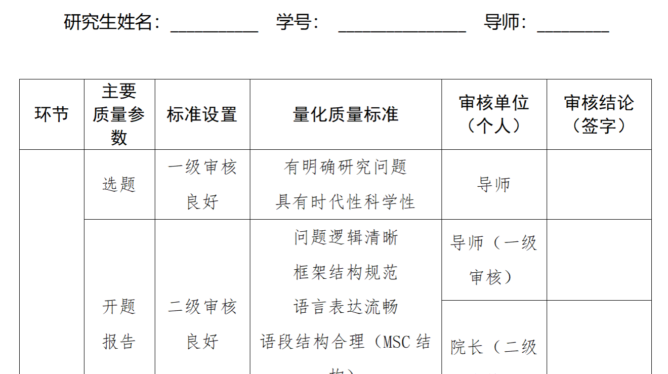 为每一位研究生定制了过程性质量管理卡片,具体包括:3个环节(开题选题、日常学习、学位论文)、7个考核指标点、18个签字审核点。在三年学习中,研究生须完成18次打卡考核方可拿到学位证。