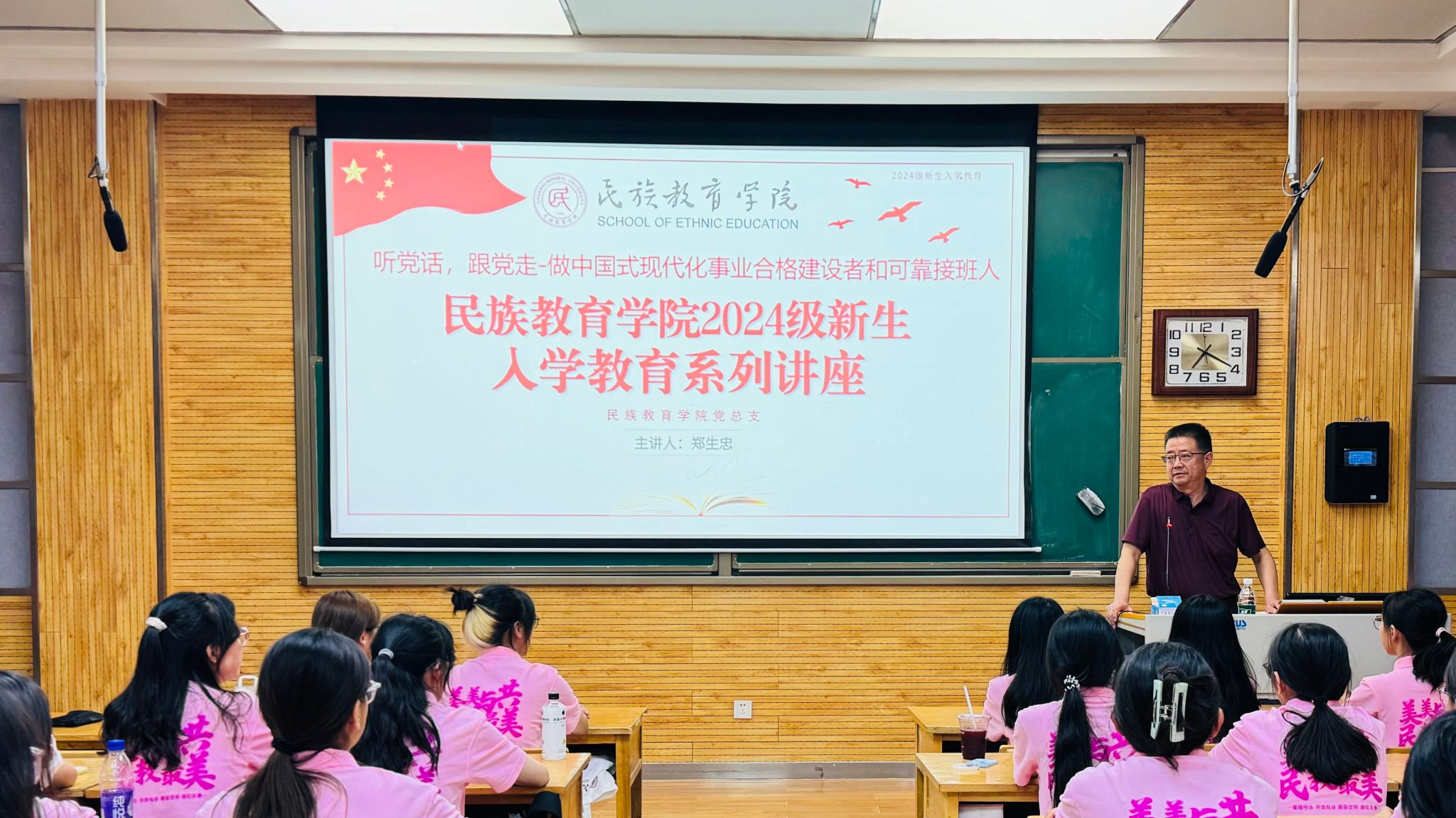 党总支书记郑生忠在雁塔校区5301教室作了以“坚定理想信念,努力奋斗融入新时代”为主题的入学教育讲座,讲座由团委书记、专职辅导员热依木·努尔麦麦提主持,2024级全体新生参加了本次讲座。