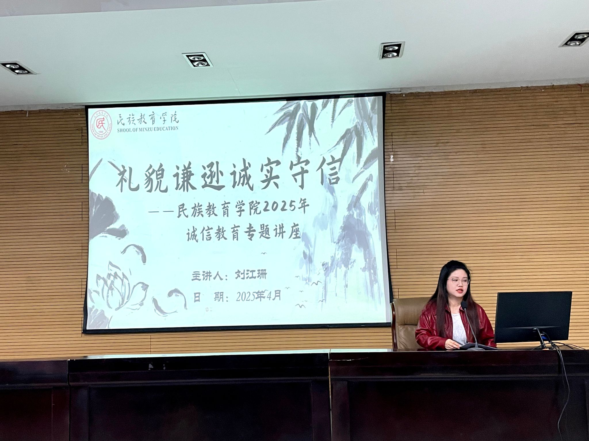 团委学生兼职副书记、兼职辅导员刘江珊主讲的大学生诚信专题教育讲座。讲座以“礼貌谦逊诚实守信”为主题,从诚信故事、诚信美德等方面展开详细讲解。通过讲述古代诚信故事,引导广大青年学生珍视诚信,以诚信修养品德,为学生们敲响诚信警钟,促使学生珍惜个人信用记录,增强在学习和生活中的诚信意识。