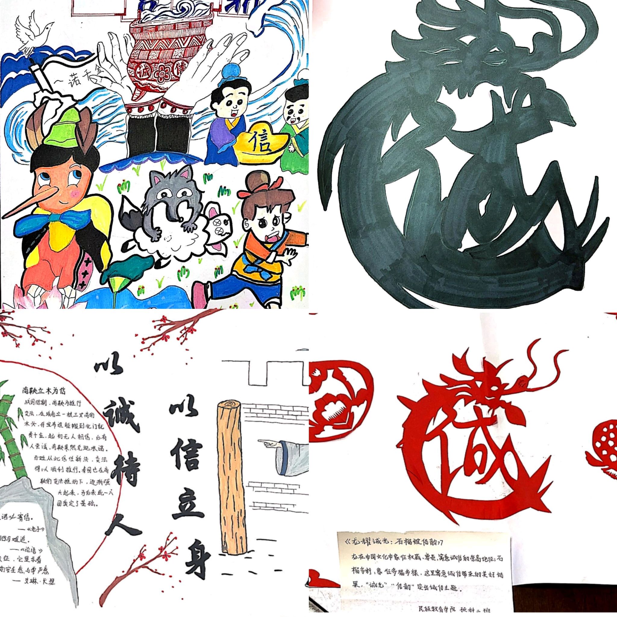 同步开展了涵盖书法、绘画、海报、篆刻、剪纸、漫画等多种形式的诚信主题作品创作活动。活动一经推出,便得到全院学生的热烈响应,参与热情高涨,各类优秀作品层出不穷,引发广泛共鸣。此次活动共收到12名学生的创新作品。