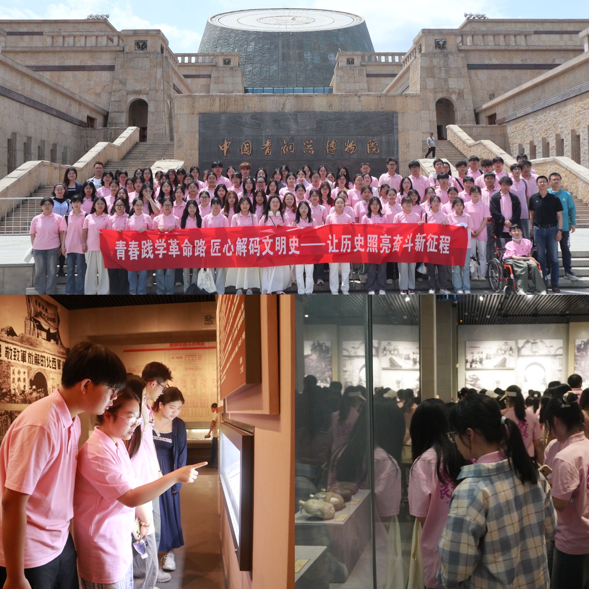 鉴往知来,向史而新。研学活动的最后一站,师生们走进宝鸡青铜器博物院。2024年9月10日,习近平总书记曾来过这里,为传承和弘扬中华优秀传统文化指明了方向。步入博物院展厅,师生们被一件件造型精美、工艺精湛的青铜器所吸引。从何尊上首次出现的“中国”二字,到墙盘上记载西周历史的铭文,每一件文物都承载着深厚的历史文化内涵。