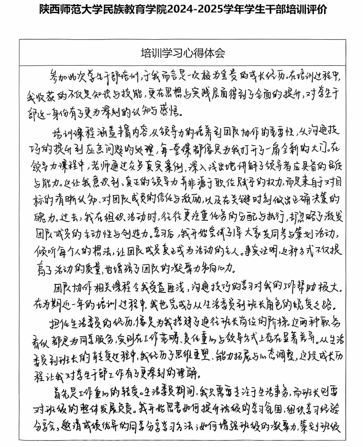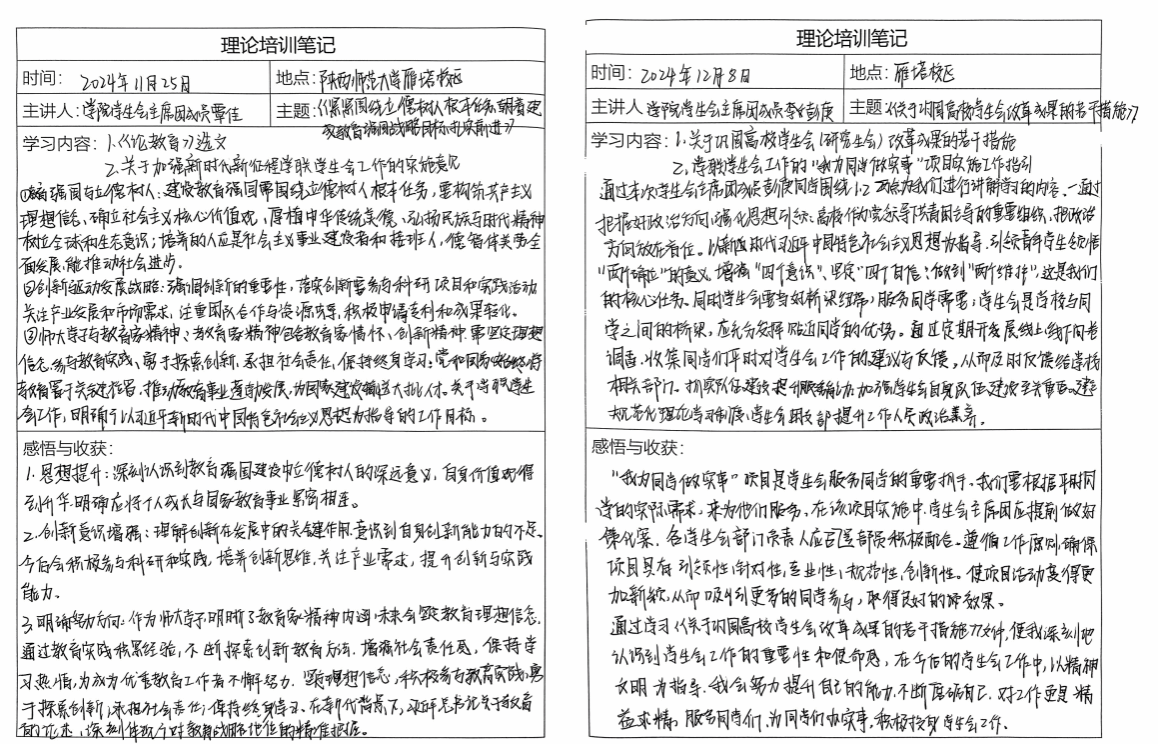 参加此次学生干部培训,于我而言是一次极为宝贵的成长经历。在培训过程中, 我收获的不仅是知识与技能,更在思想与实践层面得到了全面的提升,对学生干部这一身份有了更为深刻的认知与感悟,也为我的学生干部工作打下了坚实的基础。我将始终牢记“服务同学”的宗旨,为同学解决实际问题。